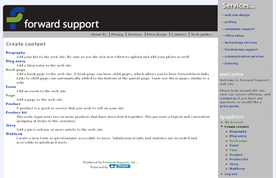 To add content to your site, you'd click on the link in your Navigation Menu that says "add content." This will bring up an overlay page that gives you all the content types available for creation on your site.