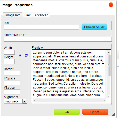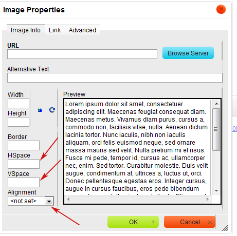 If you want your image to sit to the left or right with the text wrapping around it, you'll need to set an alignment for the image. This is at the bottom of the Image Properties pop-up. Choosing left will put the image on the left with text wrapping on the right. Choosing right will put the image on the right with text wrapping on the left.